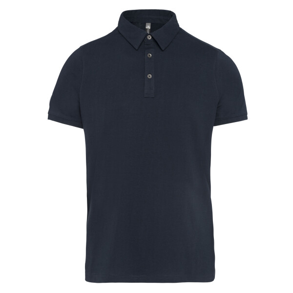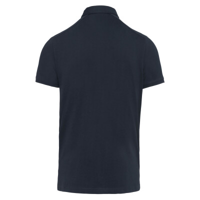 Jersey knit fabric. Three metal button placket. Shoulder yoke. Ribbed cuffs. Twin needle hem.