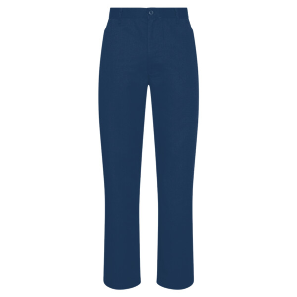 Traditional waistband with belt loops. Concealed zip fly with button over. Two side swing pockets. Rear open pocket.