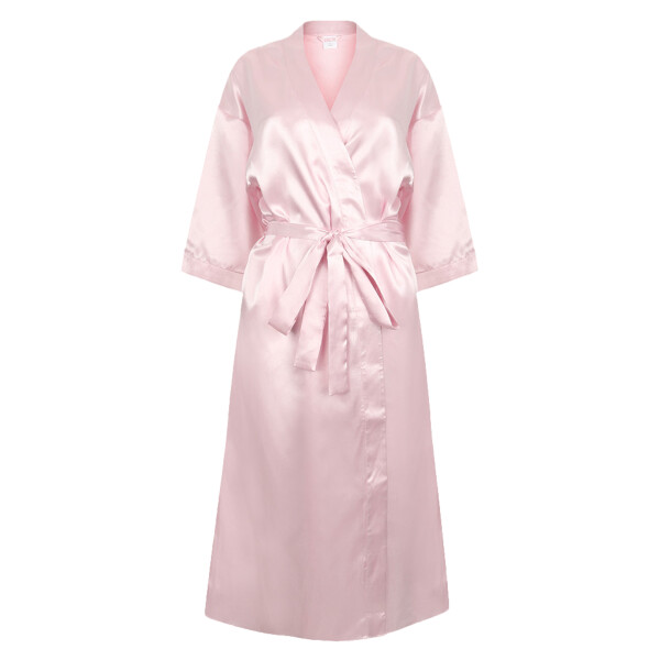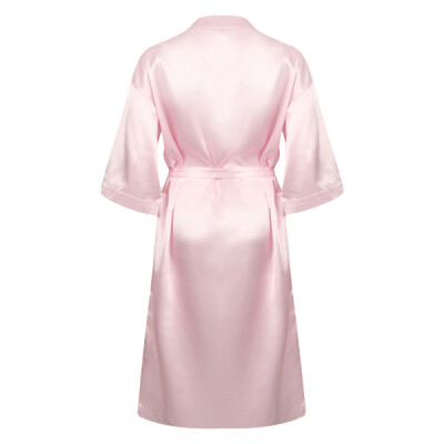 Kimono style robe. 3/4 length sleeves. Self fabric tie front. Side pockets. Below knee length. No label.