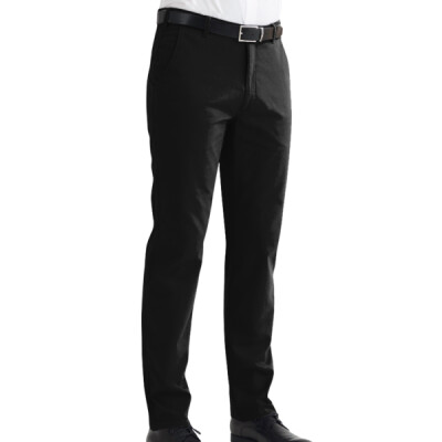 Slim fit. Stretch waistband. Flat front. Belt loops. Zip fly with button over. Two side pockets.