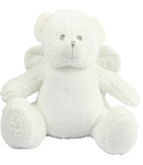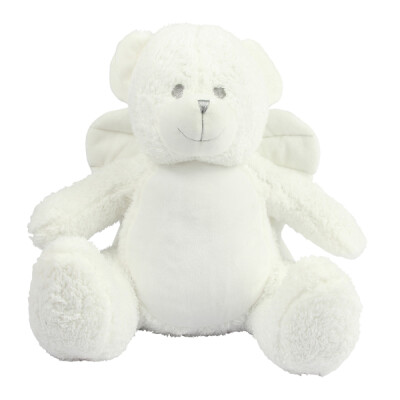 White coloured soft plush bear. Contrast eyes and nose. Fabric wings. Removable inner pad. Zip access for decoration onto front panel. Suitable for embroidery print and sublimation.