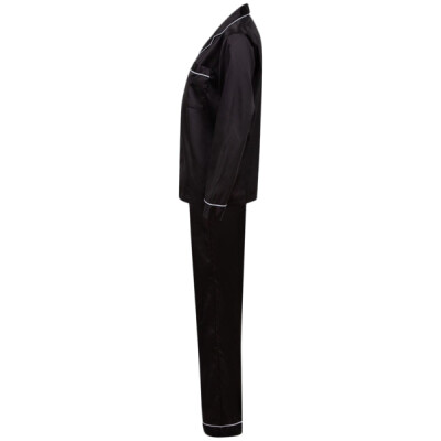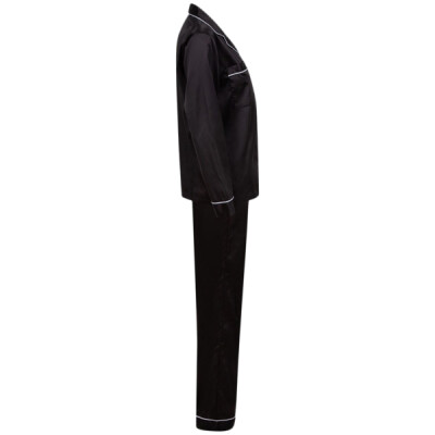 Shirt with notched collar. Self colour pearlised plastic buttons. Contrast piping around collar and centre front opening. Self fabric cuffs with contrast piping. Trousers have elasticated waistband with mock white drawcord. Contrast piping on leg ends.