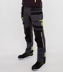 Contrast panels 65% polyester/35% cotton ripstop. Four way stretch. Part elasticated waistband with high rise back. Belt loops. Zip fly with button over. 16 pockets including two detachable holster pockets side rear and multi-functional thigh pockets.