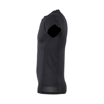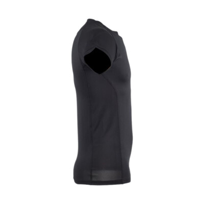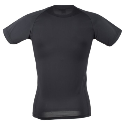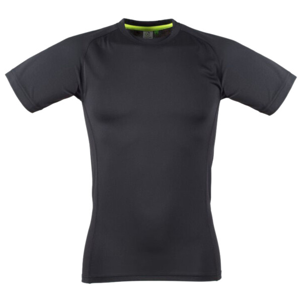 90% polyester/10% elastane. Slim fit. Self fabric neckline. Raglan sleeves. Mesh side panels and back yoke. Flatlock stitching. Twin needle sleeves and hem. Tear out label.