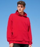Drop shoulder style. Oversized fit. Double fabric hood. Taped neck. Front pouch pocket. Ribbed cuffs and hem.