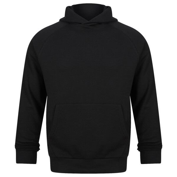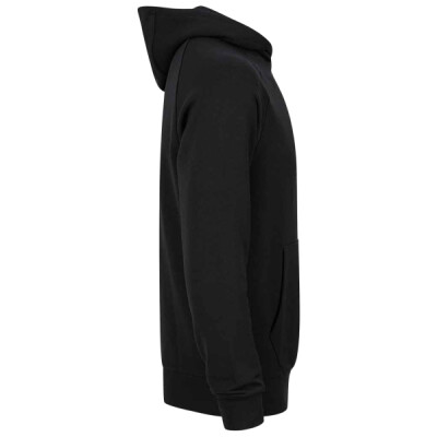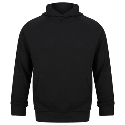 60% cotton/40% polyester. Brushed back fleece. Raglan sleeves. Slim fit. Three panel jersey lined hood. Front pouch pocket. Longer length. Ribbed cuffs and hem with elastane. Tear out label.