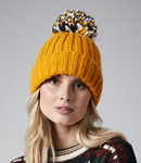 Polyester shearling lining. Heavyweight ribbed knit design. Oversized luxury pom pom. Cuffed design. Tear out label.