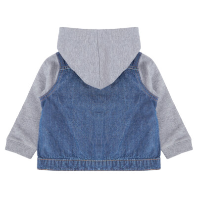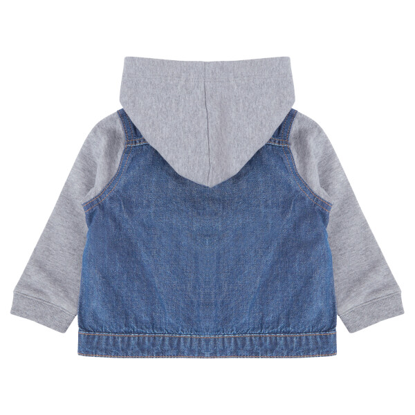 Contrast hood and sleeves. YKK popper front closure. Two chest pockets. Ribbed cuffs. Jean style stitching on body. Tag free.