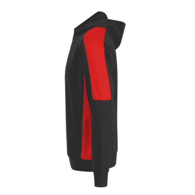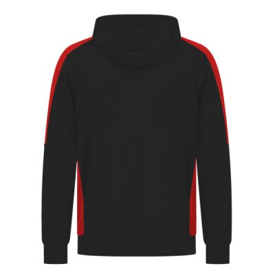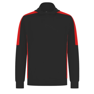 Brushed back fleece. Drop shoulder style. Three panel hood. Crossover neck detail. Contrast shoulder, upperarm and side panels (black and navy are self colour). Two front zip pockets. Ribbed cuffs and hem. Tear out label.