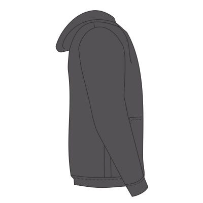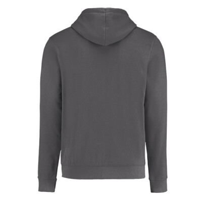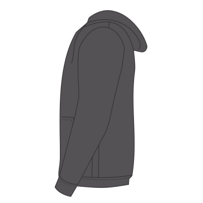 Brushed back jersey. Drop shoulder style. Double fabric hood with flat lace drawcord. Taped neck and shoulders. Full length covered metal zip. Front pouch pockets with flatlock stitching.