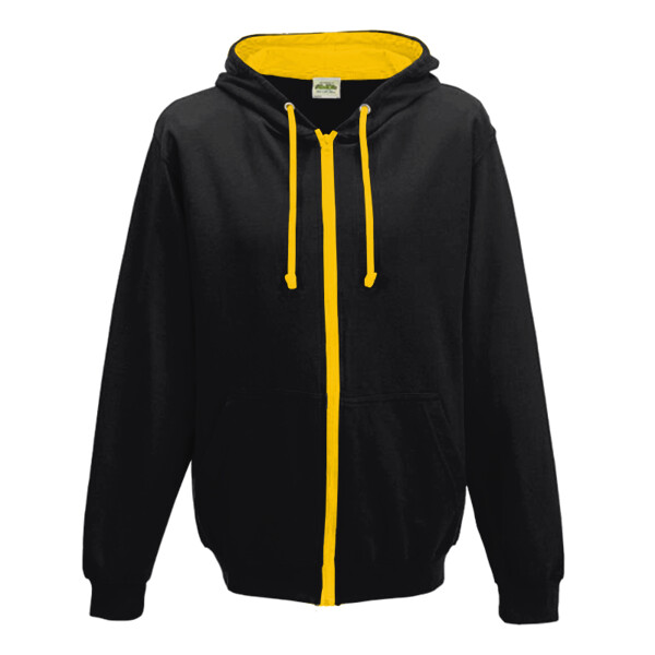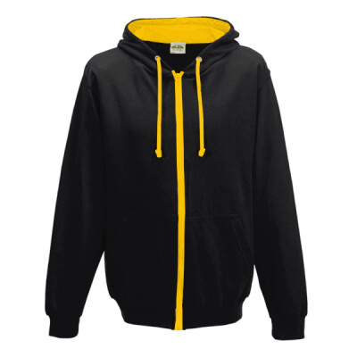 Soft cotton faced fabric. Brushed back fleece. Double fabric hood with contrast inner. Contrast flat lace drawcord. Full length contrast plastic zip. Front pouch pockets.