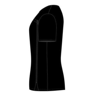 Easy care fabric. Cross over neckline. Asymmetric zip front. Vented cuffs. Princess seams with topstitch. Side vents.