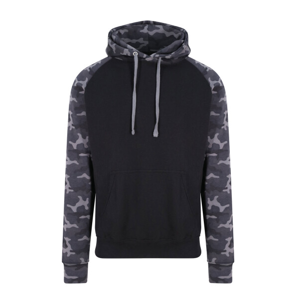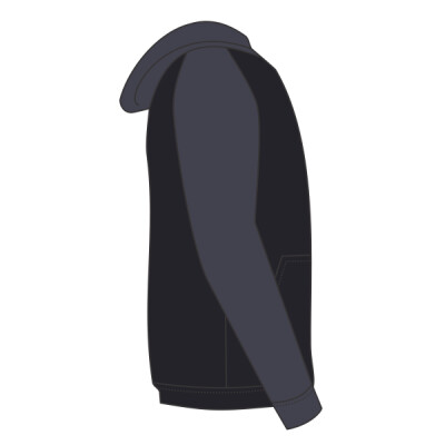 Soft cotton faced fabric. Brushed back fleece. Contrast raglan sleeves. Contrast double fabric hood with flat lace drawcord. Front pouch pocket. Ribbed cuffs and hem.