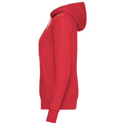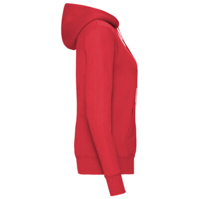 Drop shoulder style. Ladies fit. Double fabric hood with self colour drawcord. Front pouch pocket. Shaped side seams. Cotton/Lycra® ribbed cuffs and hem.