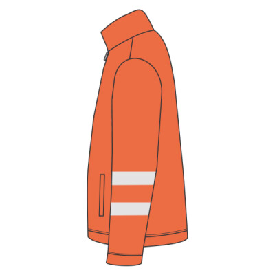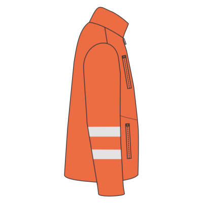 93% polyester/7% elastane outer. Micro fleece inner layer. Polyester tricot upper back lining. Conforms to EN ISO 20471: 2013 + A1: 2016 class 2. Waterproof 5000mm, breathable 3000g and windproof TPU membrane. Full length zip with chin guard and inner zip guard. Two sewn-in reflective bands around the lower body and sleeves. Right chest zip pocket. Two front zip pockets. Large inner pocket. Inner media pocket. Front and back yoke. Open cuffs. Adjustable drawcord hem. Curved back hem.