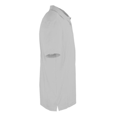 Easy care moisture wicking fabric. Ribbed collar and cuffs. Three self colour button placket. Panelled detail for more fitted shape. Side vents. Twin needle hem.