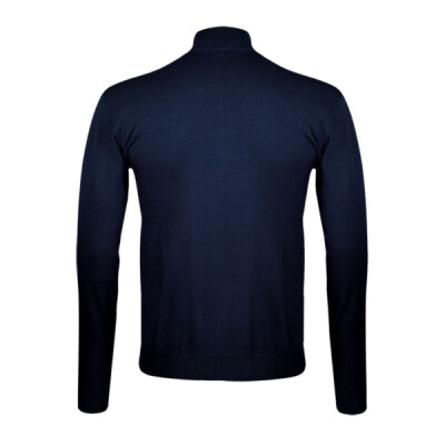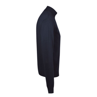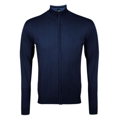 12 gauge. Set in sleeves. 1x1 ribbed high collar with inner contrast stripe. Covered zip. 1x1 elastane rib at cuffs and hem.