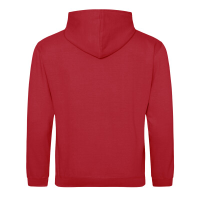Drop shoulder style. Brushed back fleece. Double fabric hood with contrast inner. No drawcords to comply with EU regulations. Front pouch pocket. Ribbed cuffs and hem.