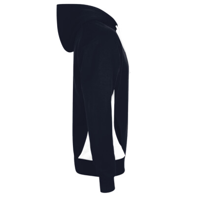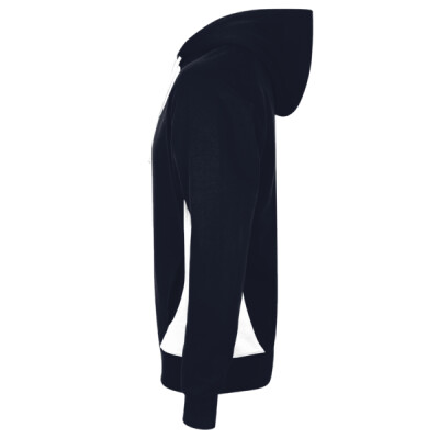 Raglan sleeves. Two panel hood with contrast lining and drawcord. Contrast piping on sleeves. Contrast shaped side panels. Two front pockets. Ribbed cuffs and hem.