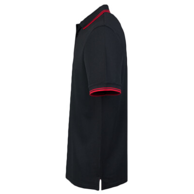 Performance wicking fabric draws moisture away from skin to keep you cool and dry. Easy care fabric. Flat knit collar and cuffs with contrast tipping. Contrast taped neck and side vents. Locker patch. Three self colour button placket.
