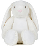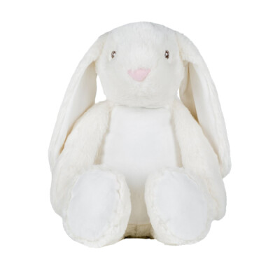 Soft plush bunny. Floppy ears. Sewn eyes. Contrast pink nose. White coloured panel on tummy and feet. Removable inner pad.