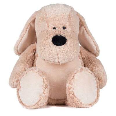Mid brown coloured soft plush dog. Floppy ears. Sewn eyes. Contrast brown nose. Light brown coloured panel on tummy and feet. Removable inner stuffing.